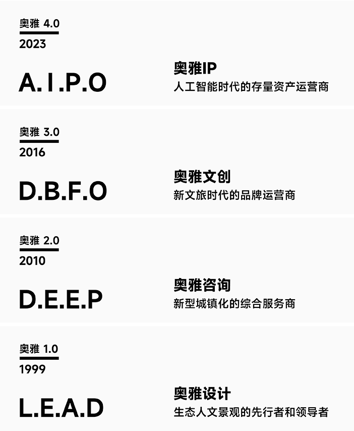 經(jīng)過多年的戰(zhàn)略布局與發(fā)展,在李方悅女士的推動(dòng)下,奧雅股份從一家設(shè)計(jì)企業(yè)成功轉(zhuǎn)型成為新銳的輕資產(chǎn)文旅開發(fā)運(yùn)營企業(yè)。奧雅以“創(chuàng)造更美好的人居環(huán)境”“讓空間賦予生命”為使命,以雙輪驅(qū)動(dòng)+雙引擎為發(fā)展格局,即創(chuàng)意設(shè)計(jì)+親子文旅雙輪驅(qū)動(dòng)、AIGC+IP雙引擎;經(jīng)營業(yè)務(wù)范圍涵蓋創(chuàng)意設(shè)計(jì)、親子文旅、數(shù)字科技等領(lǐng)域,為城市更新、鄉(xiāng)村振興、文化古城等不同場景提供全程化咨詢與綜合運(yùn)營服務(wù)。在實(shí)現(xiàn)企業(yè)價(jià)值和理想的同時(shí),解決當(dāng)代中國的實(shí)際問題與需求,創(chuàng)造具有地域特色、人性化和充滿活力的新舊城市空間和綜合文化旅游項(xiàng)目。